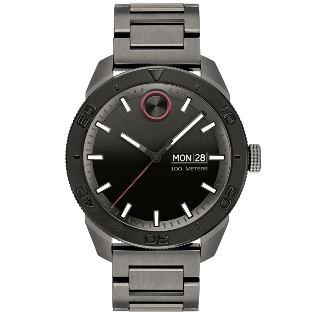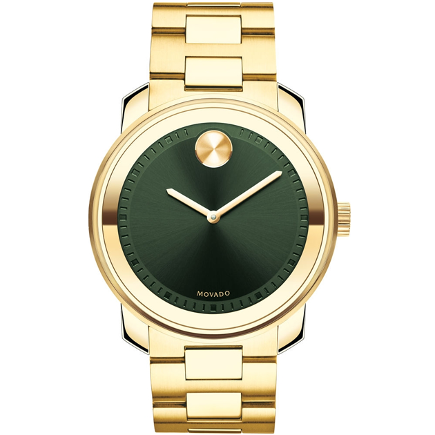 Movado BOLD Sport, 43.5 mm pale yellow gold ion-plated stainless steel case with black-toned dial on pale yellow gold ion-plated stainless steel link bracelet.