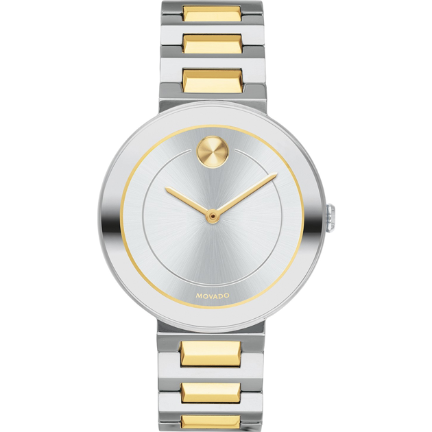 A pale yellow gold-tone augments the refined link stainless steel bracelet and famous Museum dial of Movado’s mid-sided BOLD watch.
