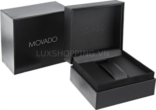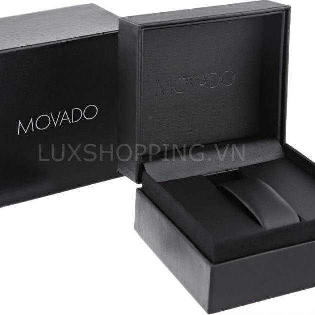 Movado BOLD Verso, 44mm black ion-plated stainless steel case. Features a black chronograph dial with Swiss Super-LumiNova® accents and date window detailing on a taupe leather strap.