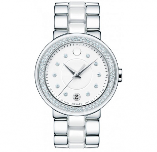 Impeccable craftsmanship with timeless accents: the Cerena watch collection by Movado. White ceramic and stainless steel link bracelet with deployant clasp. Round case, 36mm, 120 diamonds at bezel (3/5 ct. t.w.), sapphire crystal. White dial with flat dot marker, three hands, date window and 11 diamond hour markers.