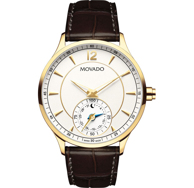 Men’s Movado Circa Motion watch with Bluetooth® connectivity, powered by MotionX®; 42 mm stainless steel case, round silvered-white dial with steps/sleep activity smart technology/date indicator subdial, silver-toned applied Arabic numeral/markers and hands, printed white minute track; black crocodile-grained leather strap with stainless steel buckle