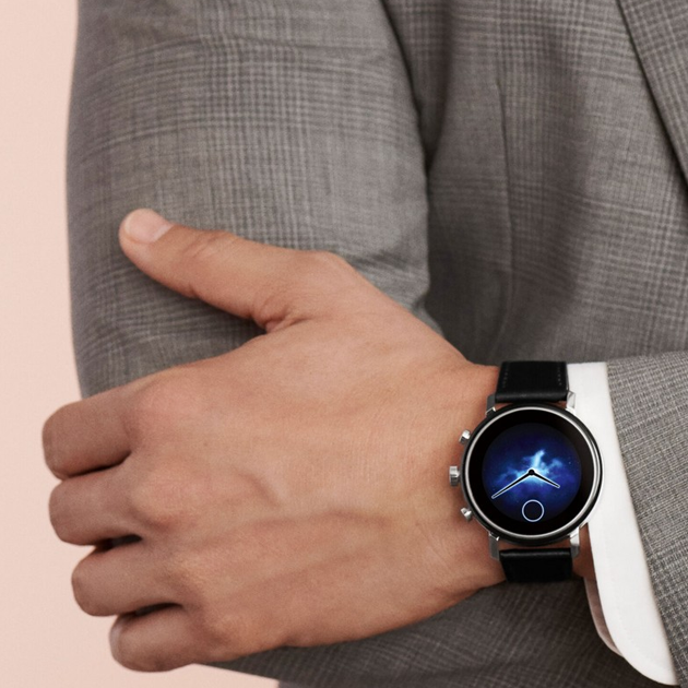Movado Connect 2.0 smartwatch, powered with Wear OS by Google™, Android/Apple iOS compatible, 42 mm stainless steel case with ceramic case back and round digital touchscreen dial featuring hundreds of customizable dial variations on a black interchangeable leather strap.