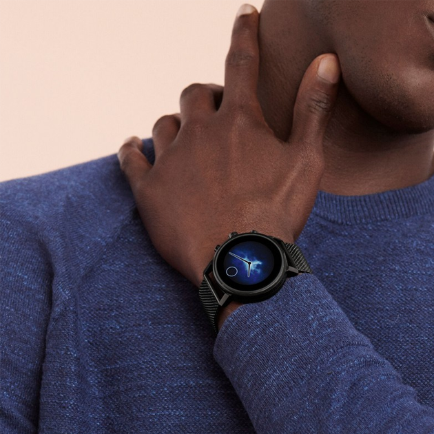 Movado Connect 2.0 smartwatch, powered with Wear OS by Google™, Apple iOS/Android compatible, 42 mm black ion-plated stainless steel case with ceramic case back and round digital touchscreen dial featuring hundreds of customizable dial variations on a black ion-plated stainless steel interchangeable mesh bracelet.
