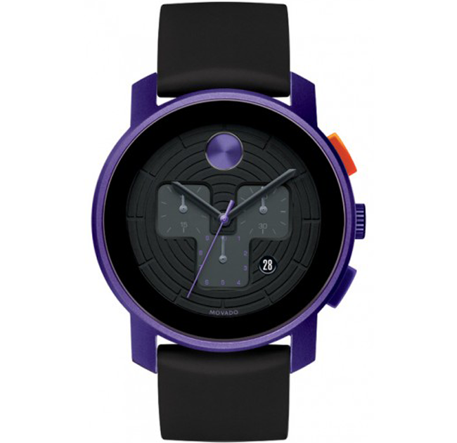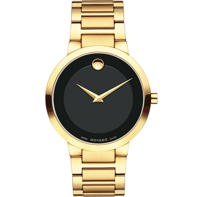 Movado Connect smartwatch, powered by Android Wear™, Android/iOS compatible, 46.5 mm gold ion-plated stainless steel case, round digital dial with edge to edge crystal, features over 100 customizable dial variations, displays phone call, appointment, email, Google Fit, apps, music, text and social media messages; equipped with Google Assistant; NFC enabled; charging cable for smart module; black silicone strap, gold ion-plated stainless steel buckle.