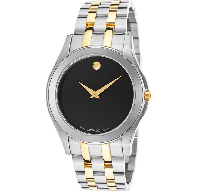 Classic watch adds a touch of elegance to an ensemble. Features a polished stainless and yellow gold-plated steel case and bracelet for a sophisticated look. Black museum dial with goldtone hands is easy to read. Swiss quartz movement provides impeccable and precise timing. Caseback is snap-down for easy battery changes. Features a goldtone Movado signature mark that symbolizes the sun at high noon for a look of luxury. A hidden butterfly clasp keeps it secure.
