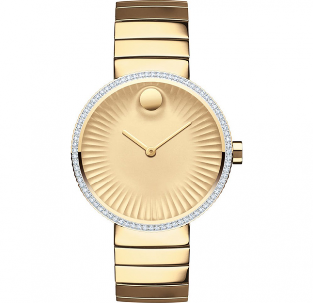 This elegant gold-tone timepiece from Movado’s Edge collection features a dazzling diamond bezel, adding glamour to any look. Gold-tone ion-plated stainless steel link bracelet with a push-button deployment clasp