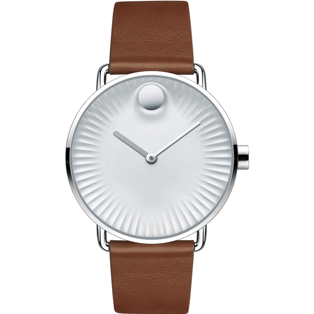 Men’s Movado Edge watch, 40 mm polished stainless steel case with tube-style lugs, concave sandblasted silver-toned aluminum dial with raised polished tonal dot, sculpted ray-textured edge, matte stainless steel hour hand and polished stainless steel minute hand, free-falling medium brown leather strap with polished stainless steel buckle.