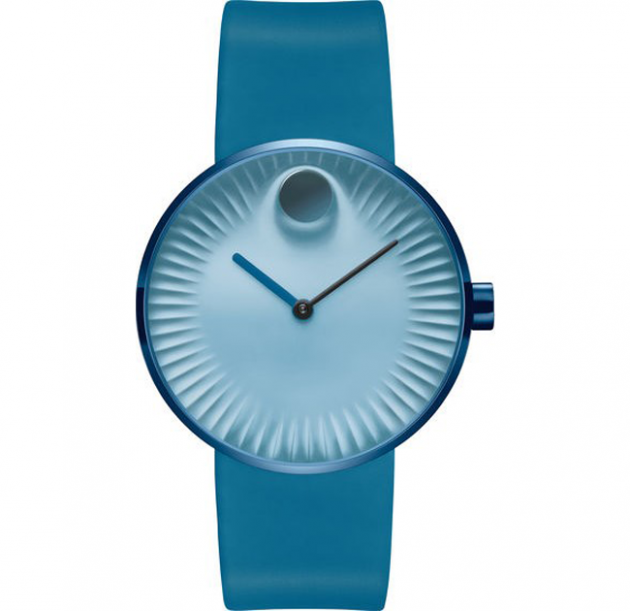 Men’s Movado Edge watch, 40 mm medium blue ion-plated stainless steel case, concave sandblasted light aqua blue aluminum dial with raised polished tonal dot, sculpted ray-textured edge, matte cerulean blue hour hand and polished black minute hand, cerulean blue silicone strap with medium blue ion-plated stainless steel buckle.
