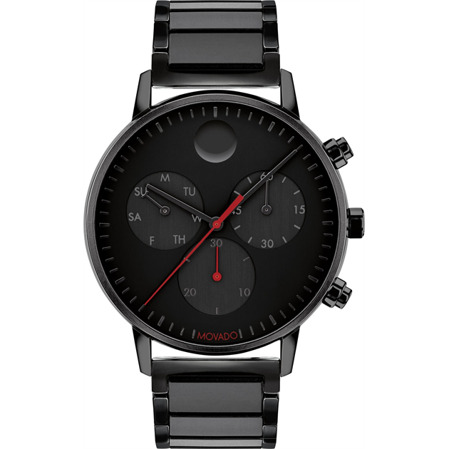 Movado Face, 43 mm black ion-plated stainless steel case and bracelet with a black chronograph dial.