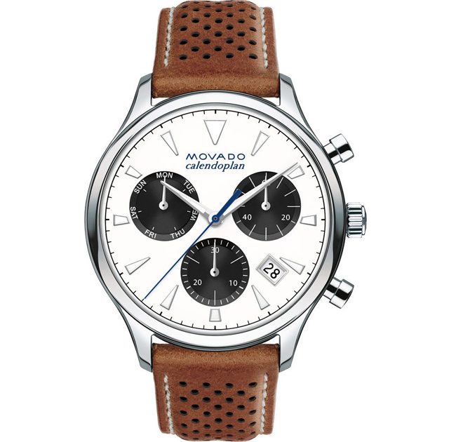 Men’s Movado Heritage Series Calendoplan chronograph, 43 mm yellow gold ion-plated stainless steel case; round parchment-colored dial with luminescent gold-toned hands and applied markers, blue subdials (day/minute counter/small seconds), printed blue minute index, date display; top-stitched black leather strap with classic yellow gold ion-plated steel buckle.