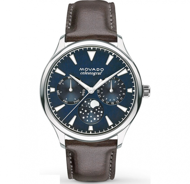 This beautiful celestograf watch features a unique navy dial that tracks the day, date and moon phase, from Movado’s Heritage series. Cola brown leather strap with buckle closure. Round stainless steel case, 36mm. Navy multifunction dial with three luminescent hands, day, date and moon-phase subdials and luminescent indices. Swiss quartz movement. Water resistant to 30 meters