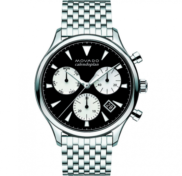 Swiss chronograph design meets stunning stainless steel style in this handsome Heritage watch from Movado. Dial black with printed index.