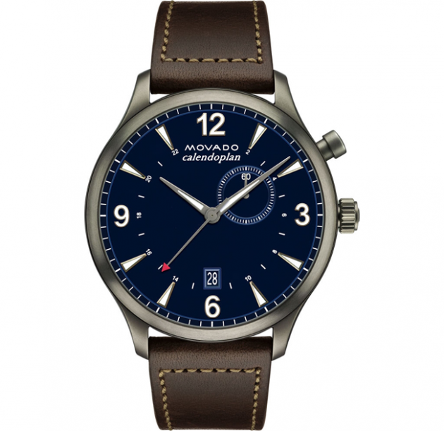 Men’s Movado Heritage Series Calendoplan GMT watch, 43 mm khaki ion-plated stainless steel case; blue lacquer dial with lumi-filled khaki hour/minute hands and applied markers, red triangle-tipped GMT dual-time hand, small seconds subdial, printed white minute/24-hour indexes, date; top-stitched chocolate leather strap, classic khaki ion-plated steel buckle.
