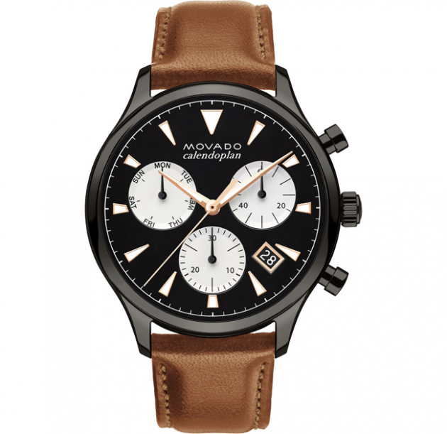 Men’s Movado Heritage Series Calendoplan chronograph, 43 mm dark grey ion-plated stainless steel case; black lacquer dial with luminescent rose gold-toned hands/applied markers, white subdials (day/minute counter/small seconds), printed white minute index, date display; top-stitched cognac leather strap with classic dark grey ion-plated steel buckle.