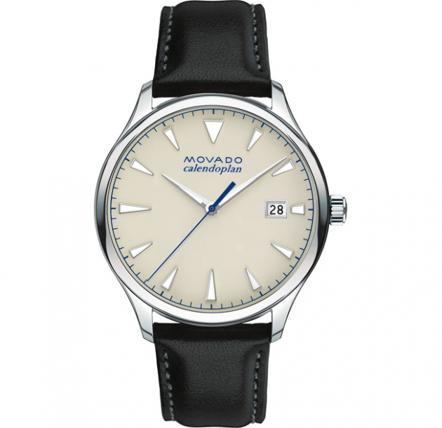 Men’s Movado Heritage Series Calendoplan watch, 40 mm stainless steel case with fluidly extended lugs; round parchment-colored 3-hand dial with luminescent silver-toned hour/minute hands and applied markers, blue seconds hand and printed minute index, and date display; top-stitched black leather strap with classic stainless steel buckle.