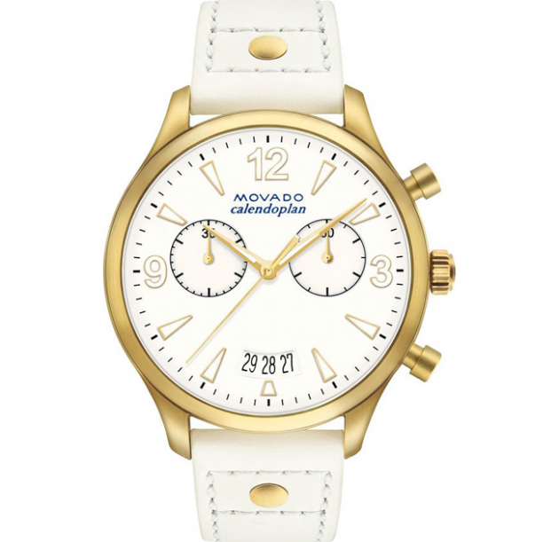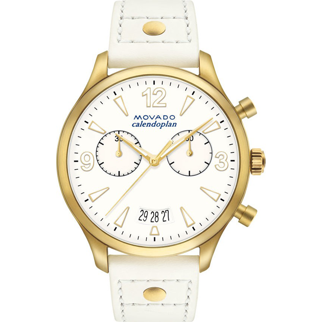 Women’s Movado Heritage Series Calendoplan chronograph, 38 mm pale gold ion-plated stainless steel case; powder white dial with 2 matching subdials (30-minute counter/small seconds), luminescent gold hour/minute hands/applied markers, printed grey minute index, date; top-stitched white leather strap with rivet detail, classic pale gold-toned buckle.