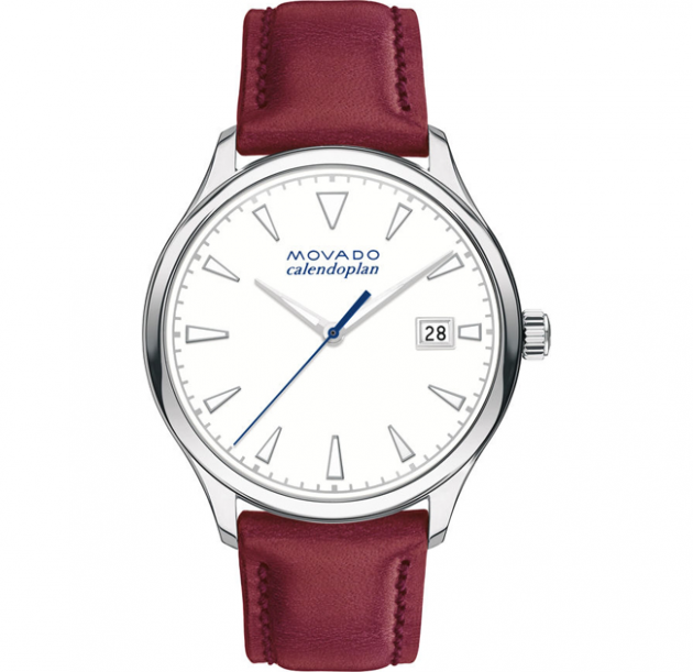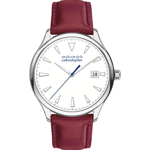 Women’s Movado Heritage Series Calendoplan watch, 36 mm stainless steel case, round white 3-hand dial with luminescent silver-toned hands and applied markers, printed grey-toned minute index, and date display, top-stitched red leather strap with stainless steel buckle.