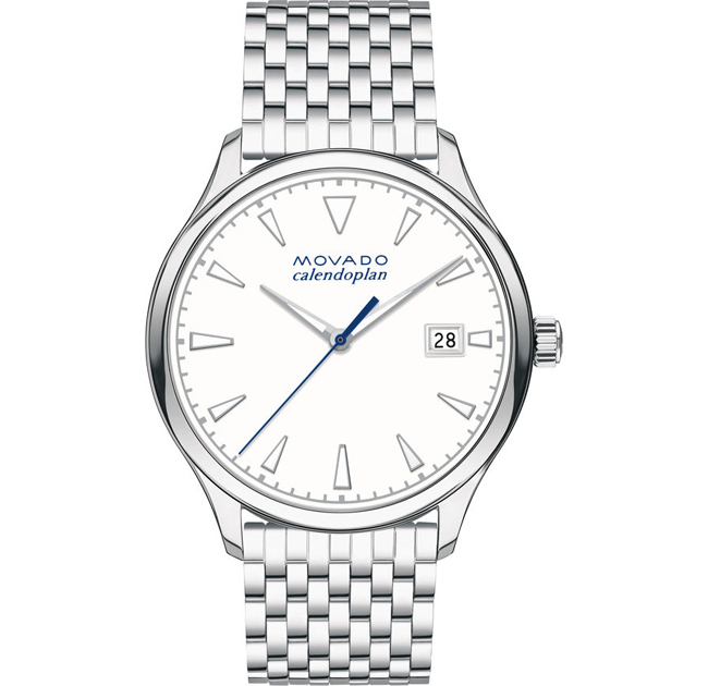 Women’s Movado Heritage Series Calendoplan watch, 36 mm rose gold ion-plated stainless steel case, round white 3-hand dial with luminescent rose gold-toned hands and applied markers, printed rose gold-toned minute index, and date display, top-stitched blue leather strap with rose gold ion-plated stainless steel buckle.