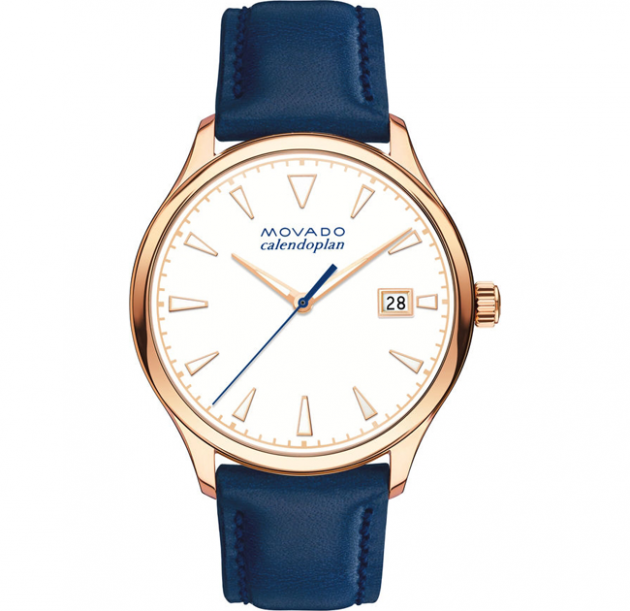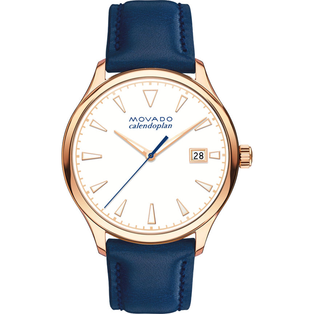 Women’s Movado Heritage Series Calendoplan watch, 36 mm rose gold ion-plated stainless steel case, round white 3-hand dial with luminescent rose gold-toned hands and applied markers, printed rose gold-toned minute index, and date display, top-stitched blue leather strap with rose gold ion-plated stainless steel buckle.