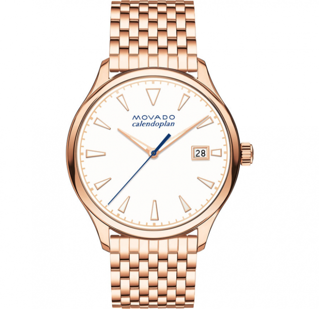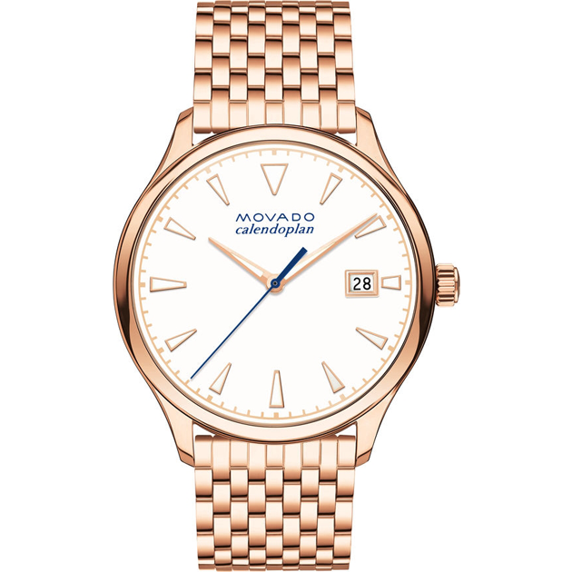 Women’s Movado Heritage Series Calendoplan watch, 36 mm rose gold ion-plated stainless steel case, round white 3-hand dial with luminescent rose gold-toned hands and applied markers, printed rose gold-toned minute index, and date display, rose gold ion-plated stainless steel brick-link bracelet with push-button deployment clasp.