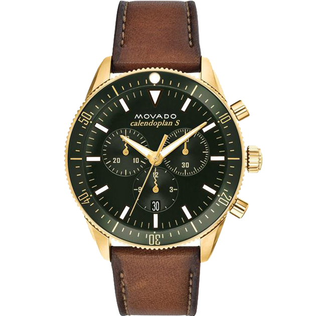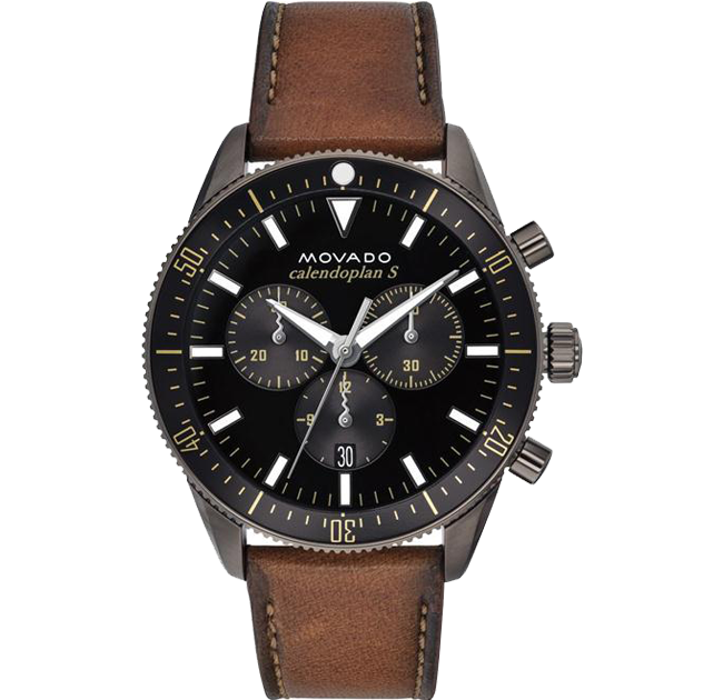 Men’s Movado Heritage Series Calendoplan S chronograph watch, 42 mm stainless steel case with fluidly extended lugs, navy ion-plated stainless steel and aluminum bezel, navy dial with matching date display and subdials, luminescent/silver-toned hands and applied markers, and printed white minute index; chocolate leather strap with top-stitching and classic stainless steel buckle.