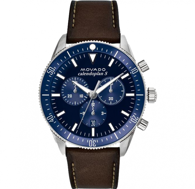 Men’s Movado Heritage Series Calendoplan S chronograph watch, 42 mm stainless steel case with fluidly extended lugs, navy ion-plated stainless steel and aluminum bezel, navy dial with matching date display and subdials, luminescent/silver-toned hands and applied markers, and printed white minute index; chocolate leather strap with top-stitching and classic stainless steel buckle.
