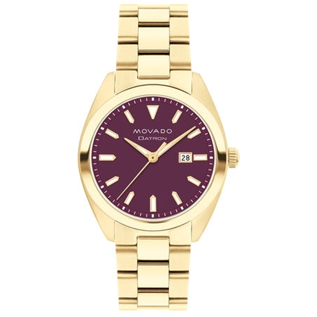 Women’s Movado Heritage Series Datron watch, 31 mm carnaition gold ion-plated stainless steel case, round orchid lacquer 3-hand dial with luminescent silver-toned hands and applied markers, printed black minute index, and date display, carnation gold ion-plated stainless steel link bracelet with push-button deployment clasp