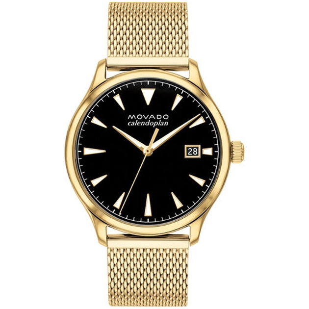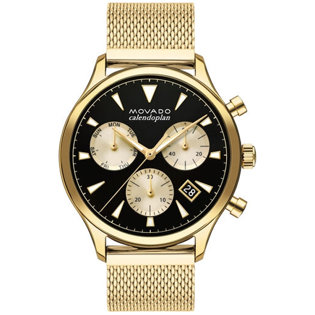 Movado Heritage Series Calendoplan Chronograph, 43 mm stainless steel case with black-toned dial on stainless steel mesh bracelet.