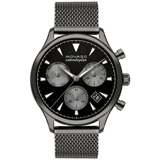 Movado Heritage Series Calendoplan Chronograph, 43 mm yellow gold ion-plated stainless steel case with black-toned dial on yellow gold ion-plated stainless steel mesh bracelet.