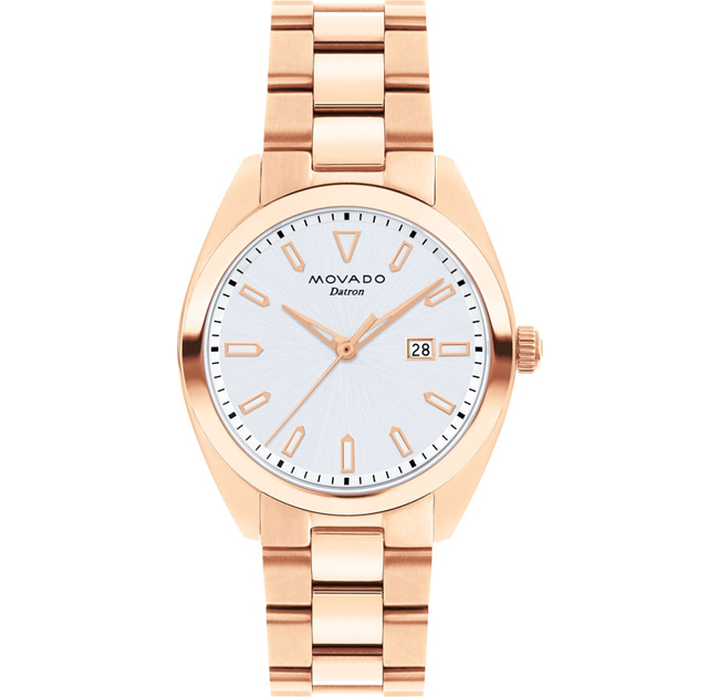 Women’s Movado Heritage Series Datron watch, 31 mm yellow gold ion-plated stainless steel case, round silver white sunray 3-hand dial with luminescent gold-toned hands and applied markers, printed black minute index, and date display, top-stitched brown leather strap with yellow gold ion-plated steel buckle.