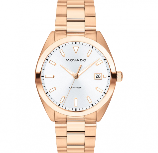 Men’s Movado Heritage Series Datron watch, 39 mm rose gold ion-plated stainless steel case, round silver white sunray 3-hand dial with luminescent rose gold-toned hands and applied markers, printed black minute index, and date display, rose gold ion-plated stainless steel link bracelet with push-button deployment clasp.