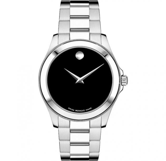 Stainless steel case with a stainless steel bracelet. Fixed stainless steel bezel. Black dial with silver-tone hands. No markers. The signature Movardo dot appears at the 12 o’clock position. Dial Type: Analog. Quartz movement. Scratch resistant sapphire crystal. Pull / push crown. Solid case back. Case diameter: 38.5 mm.