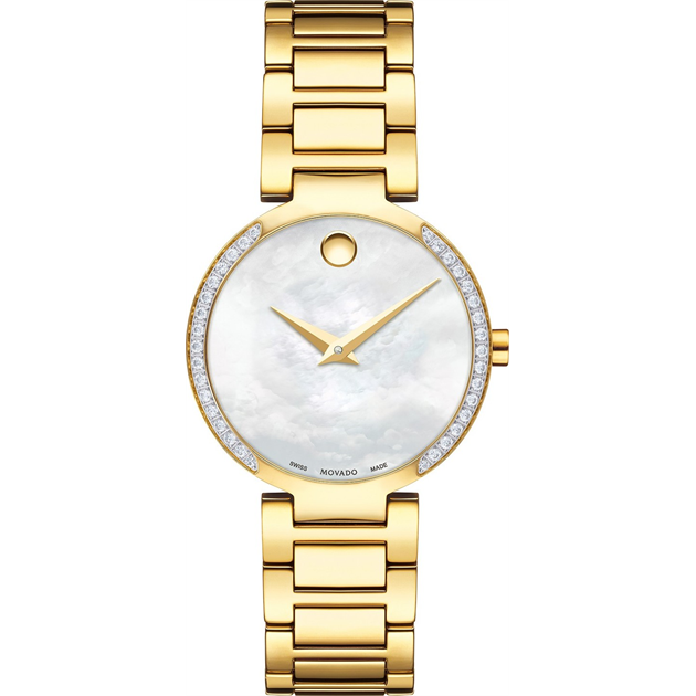 Movado Kora, 28 mm two-tone stainless steel and pale yellow gold PVD-finished stainless steel case and bracelet with white mother of pearl dial and diamond set bezel.
