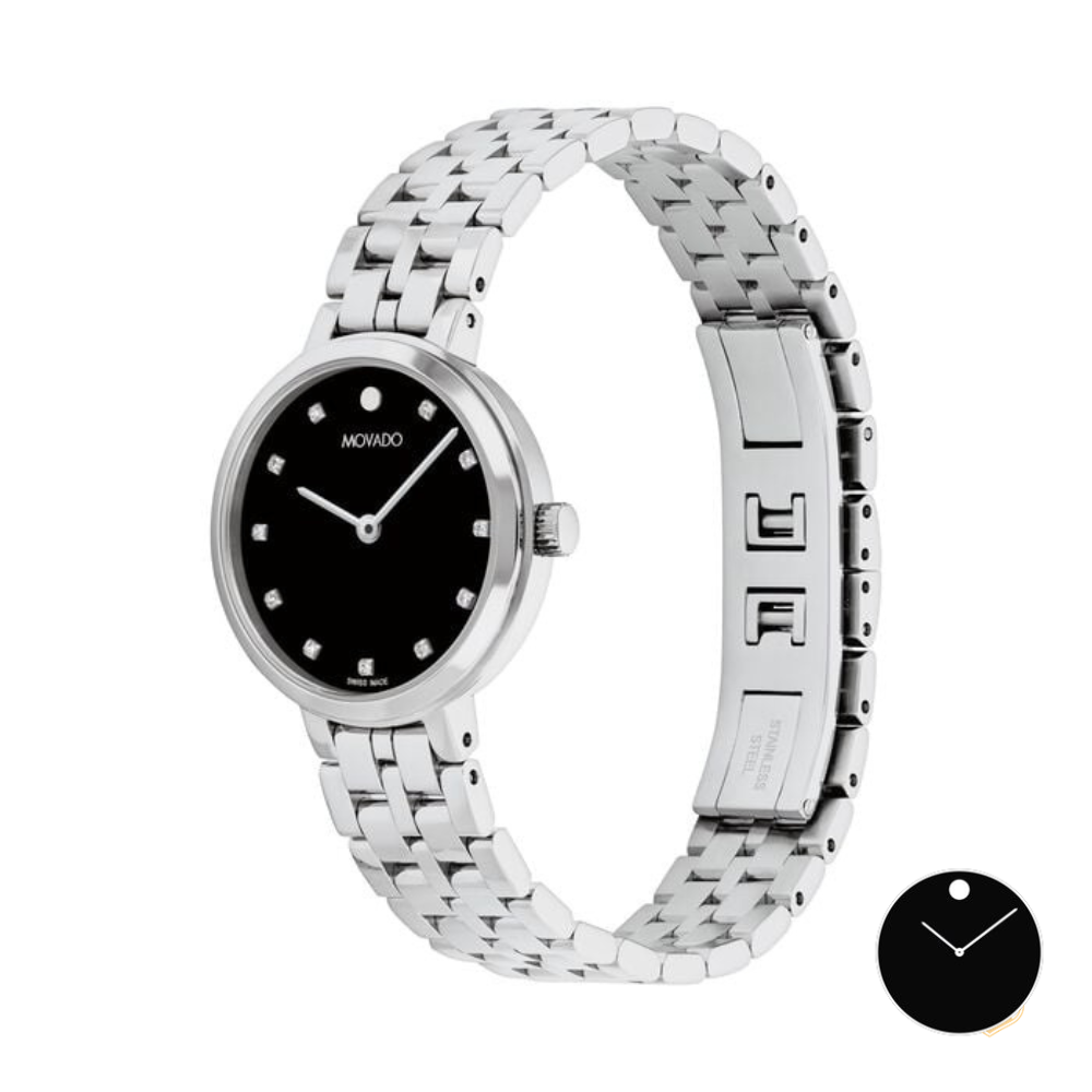 Biểu tượng của thiết kế hiện đại. Đồng hồ Movado Kora dành cho nữ, vỏ thép không gỉ 28mm, mặt số màu đen với các vạch kim cương, dây đeo mắt xích bằng thép không gỉ, tinh thể sapphire, bộ máy thạch anh Thụy Sĩ, khả năng chống nước 30 mét
