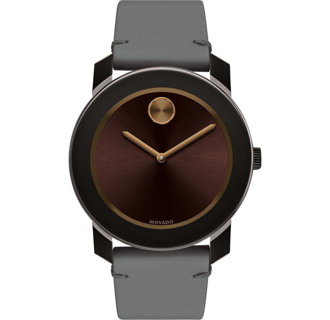 Large Movado BOLD chronograph, 43.5 mm dark brown TR90 composite material and stainless steel case, brown sunray dial with bronze-toned sunray dot, hands and reflector, and date display, grey Colorado bull hide leather strap with black tack-stitch detail and brown ion-plated stainless steel buckle.