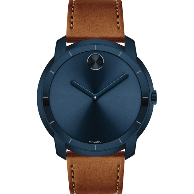 Large Movado BOLD, thin 44 mm ink blue ion-plated stainless steel case, K1 crystal with a ring of ink blue metallization with hour index, ink blue sunray dial with matching sunray dot and hands, cognac leather strap with matching top-stitching, ink blue ion-plated stainless steel buckle.