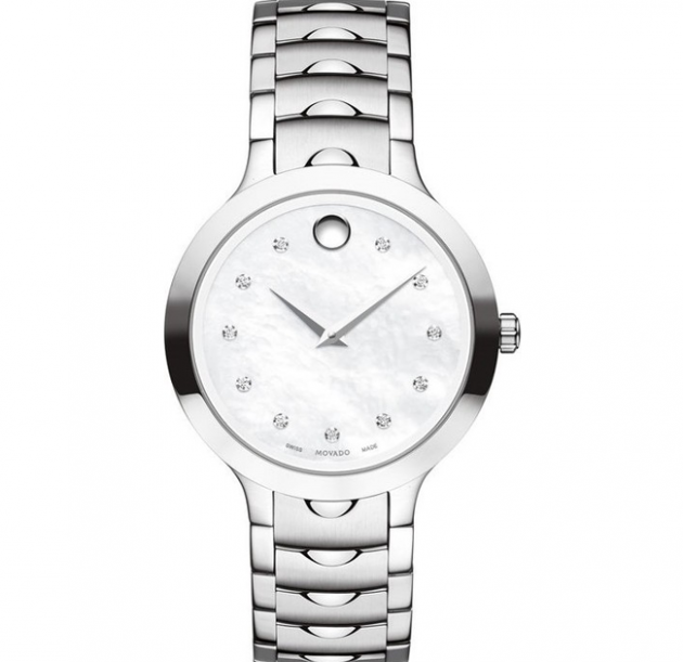 White mother of pearl dial with silver-tone hands and diamond hour markers. Deployment clasp with a push button release. Additional Info: dial set with 11 diamonds (0.042 t.c.w.).