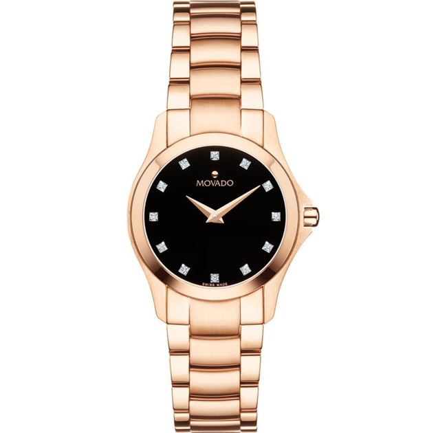 Women’s Masino watch, 26 mm yellow gold PVD-finished stainless steel case with sculpted sport lugs, round black dial with 12 diamond hour markers (0.0468 t.c.w.) yellow gold-toned hands, yellow gold PVD-finished stainless steel link bracelet with deployment clasp.