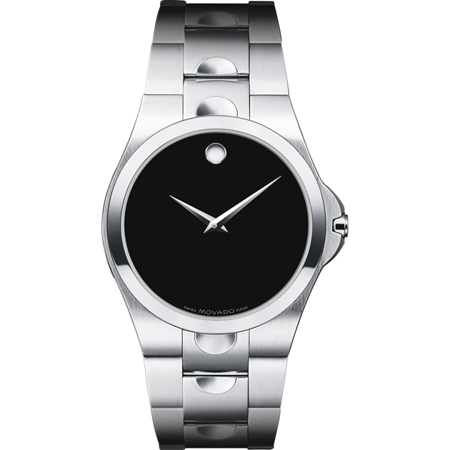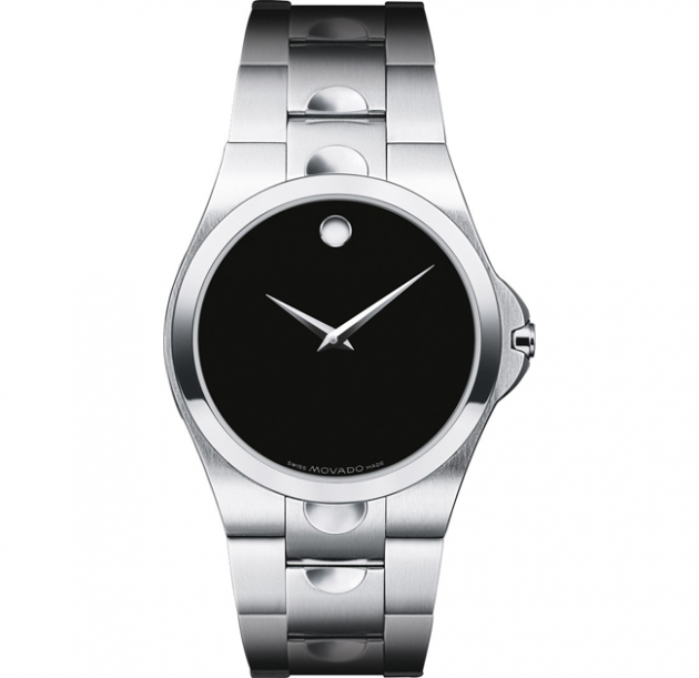 Stainless steel case with a stainless steel bracelet. The signature movado dot appears at the 12o’clock position. Crystal. Solid case back.