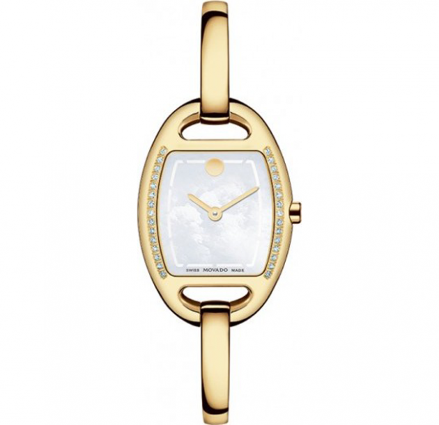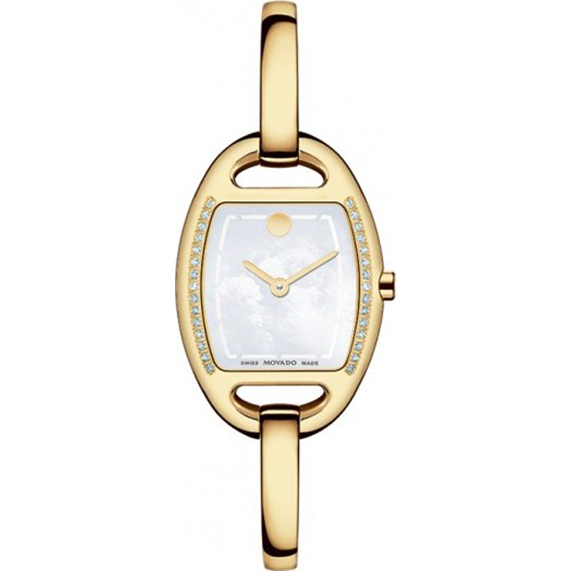 Gold-tone stainless steel case and bangle bracelet. Fixed gold-tone steel bezel set with diamonds. Mother of pearl dial with gold-tone hands and index hour markers. Movado dot marks the 12 o’clock position.