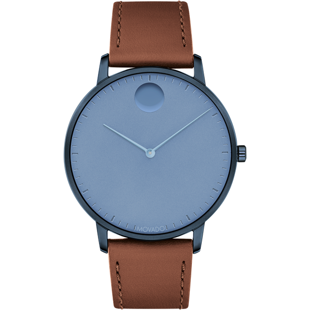 Movado Modern 47, 40 mm mid grey PVD-finished stainless steel case with blue-toned dial on blue leather strap.