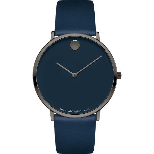 Movado Modern 47, 40 mm mid grey PVD-finished stainless steel case with blue-toned dial on blue leather strap.