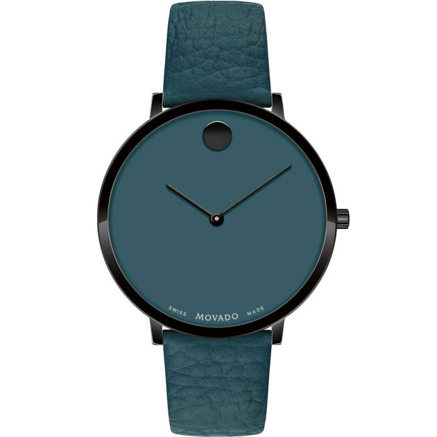 Modern 47, 35 mm dark gunmetal PVD-finished stainless steel case with blue-toned dial on textured blue strap.