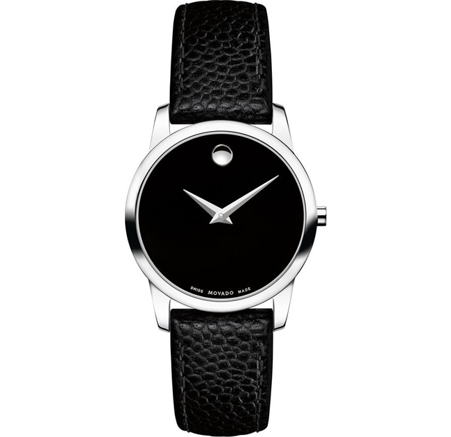 Stainless steel case with a black leather strap. Fixed stainless steel bezel. Black museum dial with silver-tone hands and no markers. The signature movado ‘dot’ appears at the 12 o’clock position hour markers. Signature movado dot appears at the 12 o’clock position. Swiss quartz movement. Scratch resistant sapphire crystal.
