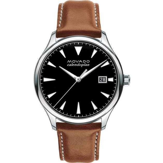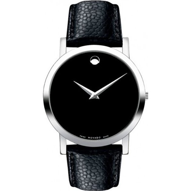 Stainless steel case with a black leather strap. Fixed stainless steel bezel. Black museum dial with silver-tone hands and no markers. The signature movado ‘dot’ appears at the 12 o’clock position hour markers. Signature movado dot appears at the 12 o’clock position. Swiss quartz movement. Scratch resistant sapphire crystal.
