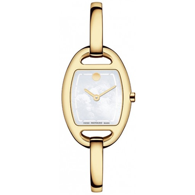 An elegant bangle that flaunts well-balanced design: the Miri watch collection from Movado. 18k gold-plated stainless steel bangle bracelet with back sizing links and jewelry clasp. Oval case with open detail, 24mm, sapphire crystal, diamond accent at crown. White mother-of-pearl Museum® dial with gold-tone hands and dot marker at twelve o’clock