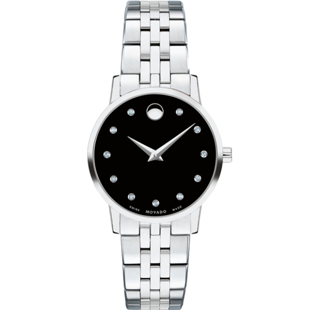 Women’s Museum Classic watch, 28 mm stainless steel case, round black dial with tone-on-tone outer ring, 11 diamond markers (0.043 t.c.w.), and silver-toned dot and hands, stainless steel link bracelet with deployment clasp..