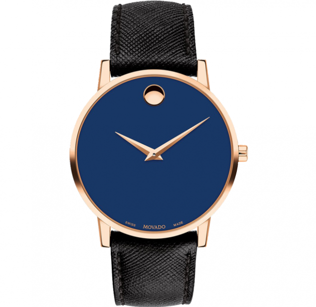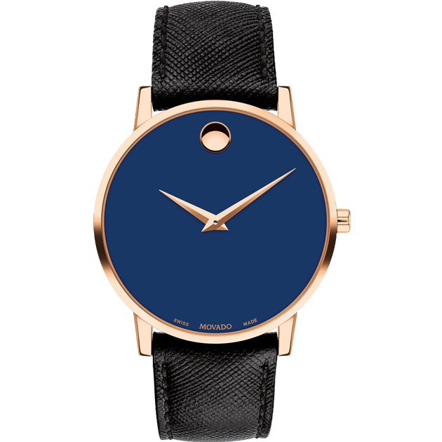 Men’s Museum Classic watch, 40 mm rose gold PVD-finished stainless steel case, blue Museum dial with rose gold-toned dot and hands, black leather strap with rose gold PVD-finished stainless steel buckle.