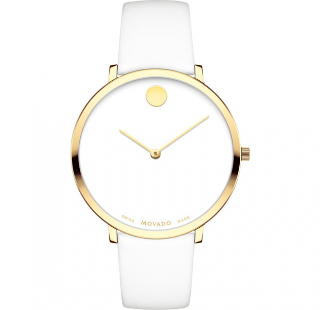 Women’s Museum Dial 70th Anniversary Special Edition watch, 35 mm ultra slim yellow gold PVD-finished stainless steel case, 5.85 mm thin, with commemorative steel case-back; white dial with yellow gold-toned original flat dot and stick hands, white calfskin strap with yellow gold PVD-finished stainless steel classic tongue buckle. Edition of 300 pieces.