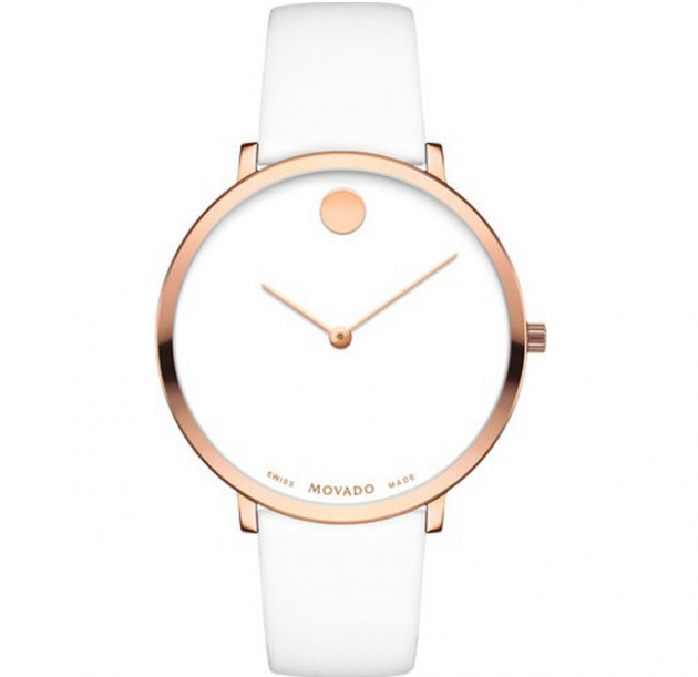 Women’s Museum Dial 70th Anniversary Special Edition watch, 35 mm ultra slim rose gold PVD-finished stainless steel case, 5.85 mm thin, with commemorative steel case-back; white dial with rose gold-toned original flat dot and stick hands, white calfskin strap with rose gold PVD-finished stainless steel classic tongue buckle. Edition of 300 pieces.